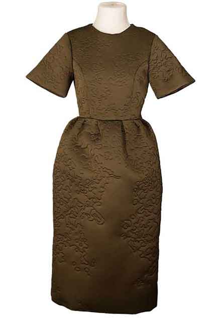 Made out of a two-layered olive acetate this dress is quilted with the German Spotted Camouflage „Flecktarn“. It has short sleeves, a round neckline and a rectangular cut-out which is underlined with sheer black silk in the back. The fit is tapered and opens up into pleats on the waistline and creates a sculptural voluminous skirt. It closes with a hidden zip on the left side and hooks on the left shoulder.