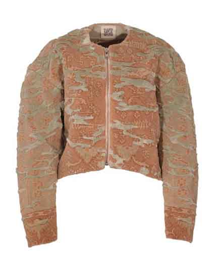 This womenâs bomber style jacket was hand-knotted in a carpet manufacture in Kathmandu, Nepal. The base layer is inspired by a traditional Iranian rug and made out of Tibetan highland wool. The upper layer is an abstract version of the US Woodland Camouflage and is knotted out of hand dyed chinese silk yarn. The weft density counts 200 knots per square inch.